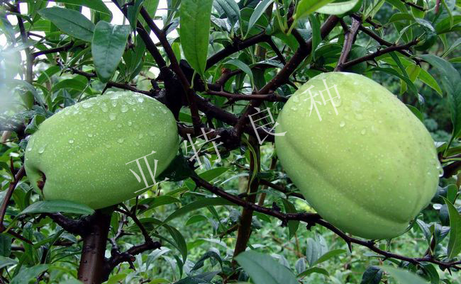 金宝萝青105木瓜C.cathayensis‘Jinbaoluoqing105' 落叶小乔木。树高可达 5m ,树皮青褐色,枝条直立具短刺;叶片长 5 -11cm ,宽 2 -4cm , 叶背密被褐色绒毛;花先叶开放, 2-6 朵簇生于 2 年生枝上,花梗短粗或无,花径 2 -4cm ;果实圆柱形,单果质量 500 -1000g ,黄色光亮,味芳香,花期 3-4 月,果 9-10 月成熟。 优点:树形优美,生长能力强,座果率高,果品质量好,抗病能力强,是加工果汁、果脯、罐头的优质原料。 Jinbao Luoqing 105 C.cathayensis‘Jinbaoluoqing105' Deciduous shrub, the height up to 5m , green-brown bark, The upright branches with short thorns, the length of blade about 5 -11cm , 2 -4 cm width, there are dense brown villi in the oryza. Before leaves blooming flowers are formed with clusters, one of which has 2-6 flowers in two-year trees; short and thick pedicel or little pedicel, 2 -4cm of flower diameter; cylindrical fruit, The weight of single fruit is 500 -1000g , yellow and light, rich fragrances, Flowering from March to April, the mature from September to October. Advantages: beautiful morphology, strong growing, high fruit set , great quality, strong resistance to diseases, one high-quality raw materials processing preserved fruit.